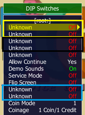Found some properties of some Unknown dipswitches. For 1st/2nd of SW1 (as in attached screen, yellow highlight), it's Lives at start. These are certain. On - On: 5 lives Off - On: 4 lives Off - Off (default): 3 lives On - Off: 2 lives (Note that the counter on screen tells the "extra" lives in reserve, not counting the one in use) For 3rd/4th of SW1 (as in attached screen, black highlight), it should be Difficulty, basing my guess also on other m90.cpp machines. I do not see yet any difference between Off/Off, Off/On, On/Off, but indeed On/On is harder (starting the game at stage 3-1 is an easy check: more and different monsters at start) For 2nd/3rd of SW2 (as in attached screen, blue highlight), it has something to do with the type of Cabinet (test with 2P game). off - off: dual controls - cocktail? off - on: dual controls - upright on - off: single control - upright on - on: same as off-off [EDIT] Also, the currently marked as Allow Continue DIPSW doesn't seem to have effect when set on No (or Yes), continue seemed always possible to me, several times in several places. (I attached a savestate of loop 2 as demo) |