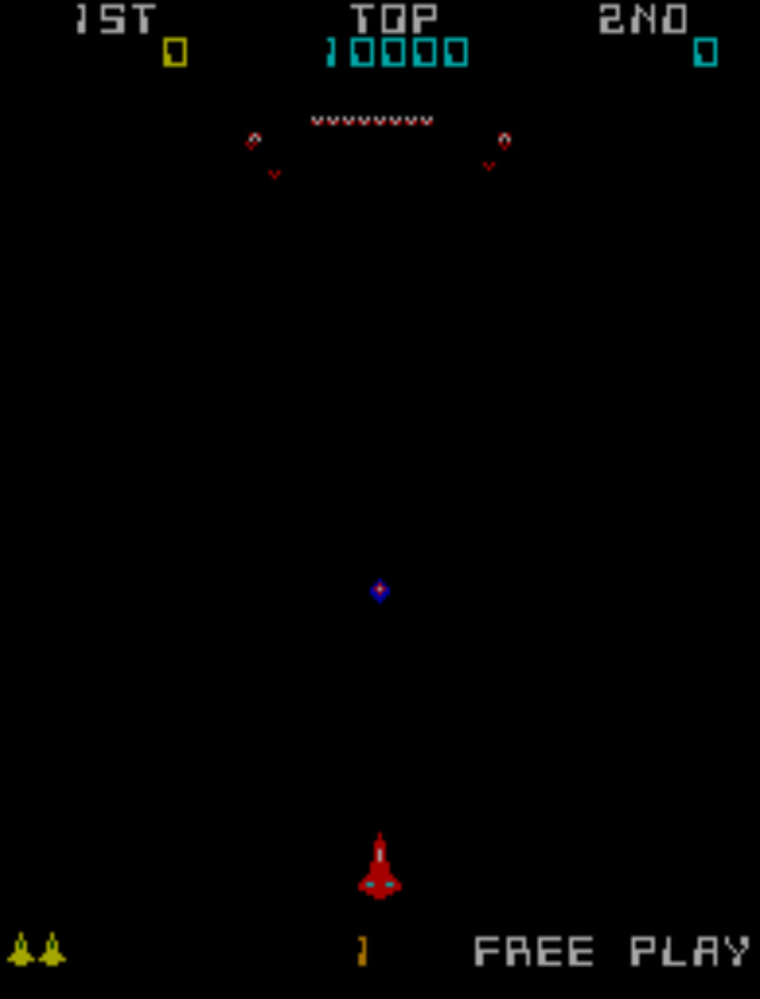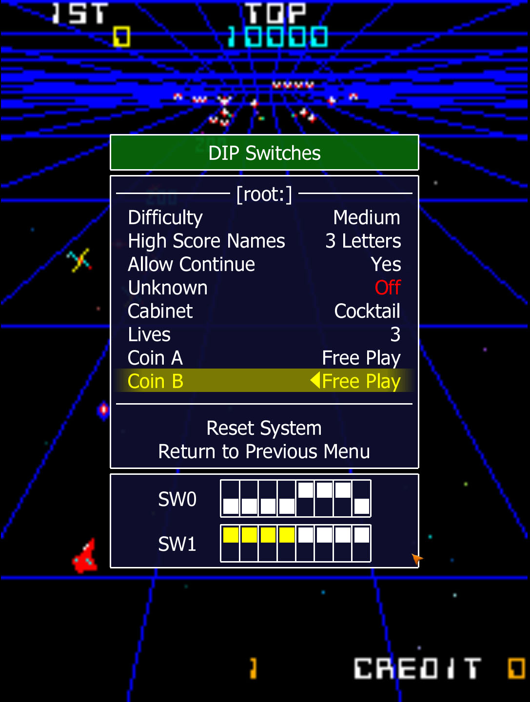In the DIP switch settings you can select Coin A and Coin B = FREE PLAY. If you do this when the game starts player 1 has no sound except when blown up and the blue grid is missing. Upon death when player 1's second ship starts, the sound and graphics are functioning properly. While this can be an issue, it is more of a slight inconvenience as there is a work around. In DIP Switch settings in MAME set Coin A: FREE PLAY and Coin B: 1 Coin / 1 Credit. If you do this the game seems to work fine. Only when both are set to FREE PLAY does the bug happen. |