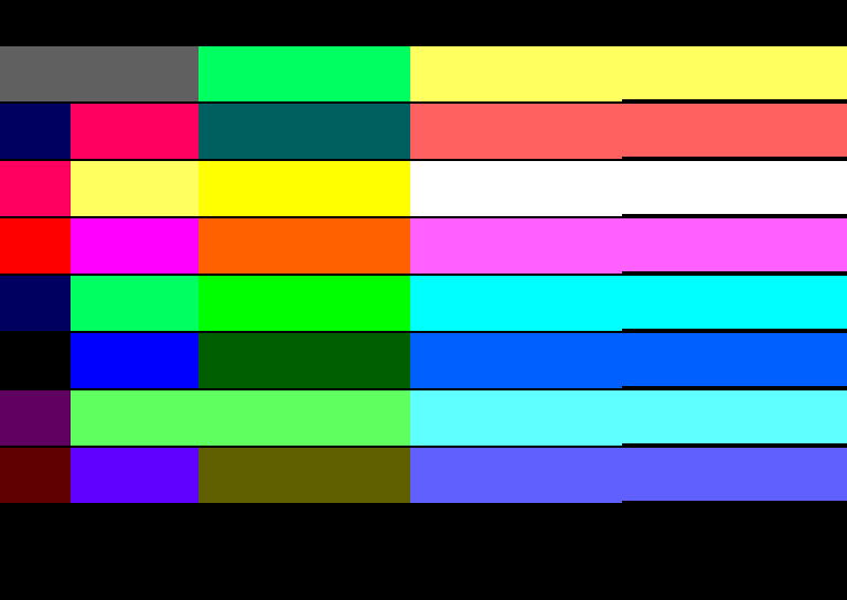 Just did a comparison with real hardware and certain colors seem to appear slightly different than shown in MAME: The main noticeable thing is how those two greens in the next to last row look identical, when the second one (present in the copyright text of Gryzor, for example) should be more vibrant. Also, the peach color in MAME seems kind of shinier than the real thing, so maybe there's other subtle differences? |