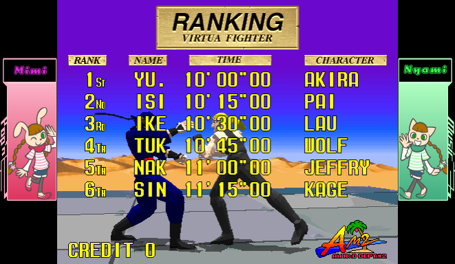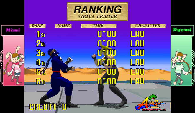 When i was listening to the Virtua Fighter musics, at one point i was like: I see there's the Name Entry track but why is it not playing in-game when i'm done? And then i saw why: The Ranking from 1st to 18th haves all 0"00 with no initials as LAU I thought at first this was related with the highscore plugin but.. i checked the highscore folder and there was no vf.hi file. After clearing the Data with "Backup Data Clear" and beating the game, now i could get to the part to put my initials.. although it's kinda glitchy with the constant flicker with the character model and the letters, i couldn't screenshot frames for that. Still, once i put my initials and see the Ranking updated, then it did created the vf.hi file and everything was back to normal. I've uploaded 2 screenshots, one with a fresh new nvram and another after choosing "Backup Data Clear" (Ignore the Mimi and Nyami backgrounds, i was having it as a generic artwork.) One extra thing i would like to say is that even after making a new nvram file, there's a weird effect with the last replay save (shown after the title screen after the rankings), because there is no data, it only shows Akira and Pai without moving for like 2 seconds and then it goes back to the title screen just to loop back to the attract mode. I would say if this also happens on an actual PCB but, i think it would behave the same. |