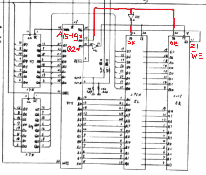 Are there different revisions of the Punch Out schematics? What I see is both dkong3 and punchout having pin 19 connected as you've just described. There is however an Arm Wrestling schematic that looks like A15 = ROM and !A14 = RAM, though. EDIT: Ok, I see, there really are two revisions of the Punch Out schematic. |