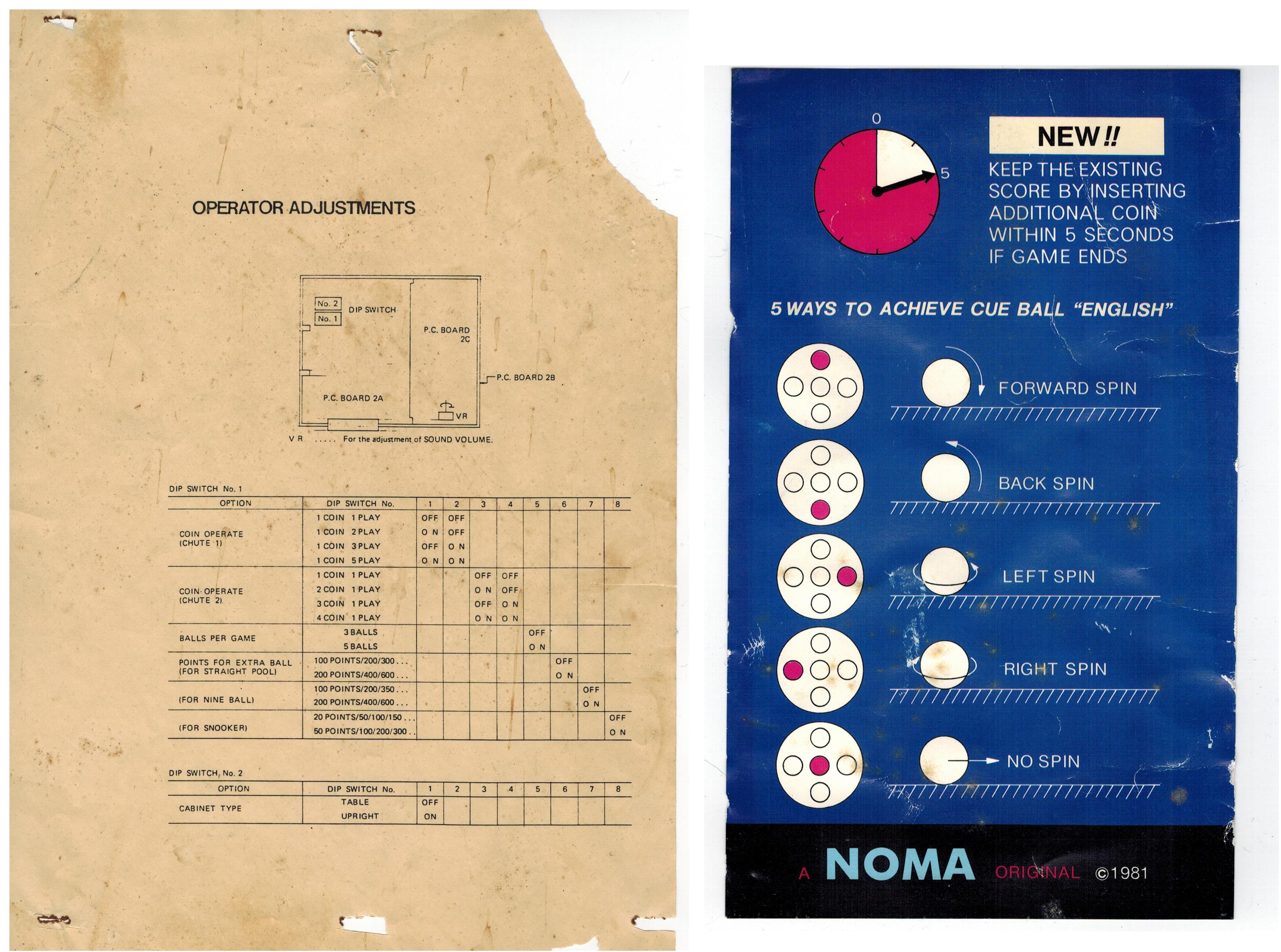 A member on KLOV forums has posted pictures of the DIP sheet from inside of his Tripool cabinet as well as the instruction cards, one of them showing a 5 button shoot layout for adding "english" to the shot or not. So there are 3 other shot choices not available in the controls at this time. The virtual DIPS for the game seem to be in correct positions as I changed the DIPS for Upright/Cocktail and Balls Per Game DIPS and the results matched the sheet picture. I am unable to choose the jack.cpp driver in the drop down menu choices above as it is not listed. Link to post on KLOV forums: https://forums.arcade-museum.com/threads/tri-pool.521621/ |