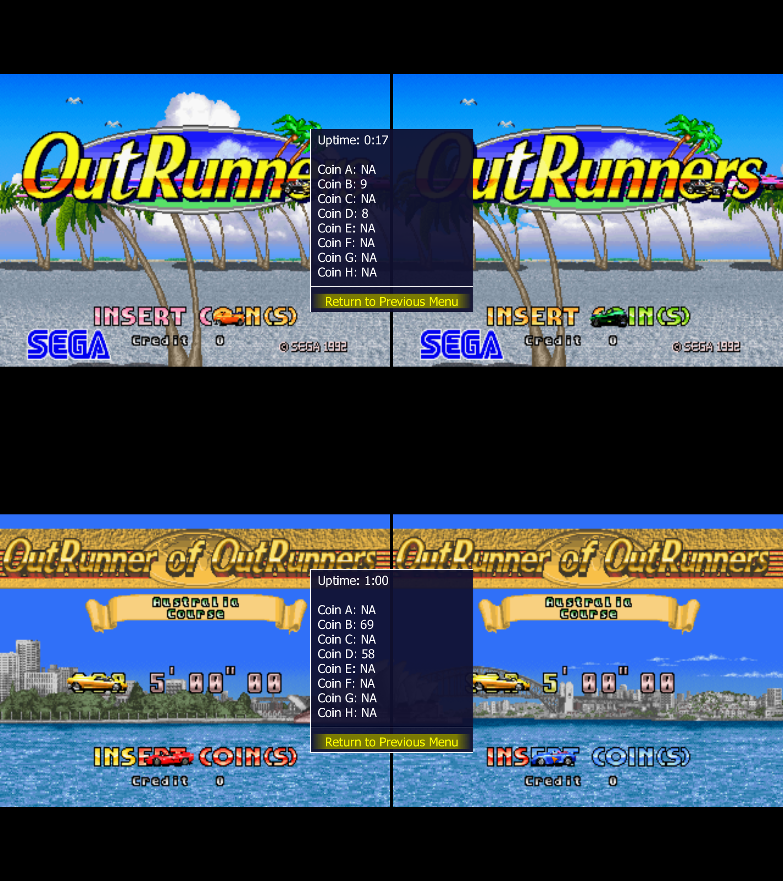 | Description | When running a game, the coin counters numbers will autoincrement on each start up as soon as the title screen appears even though credits are not being added by the user. When you TAB to Bookkeeping in the UI, you can see the counters going up once per second. The Coin B counter sometimes goes up by 2 while the Coin D counter is consistent with increasing by only 1. | ||||