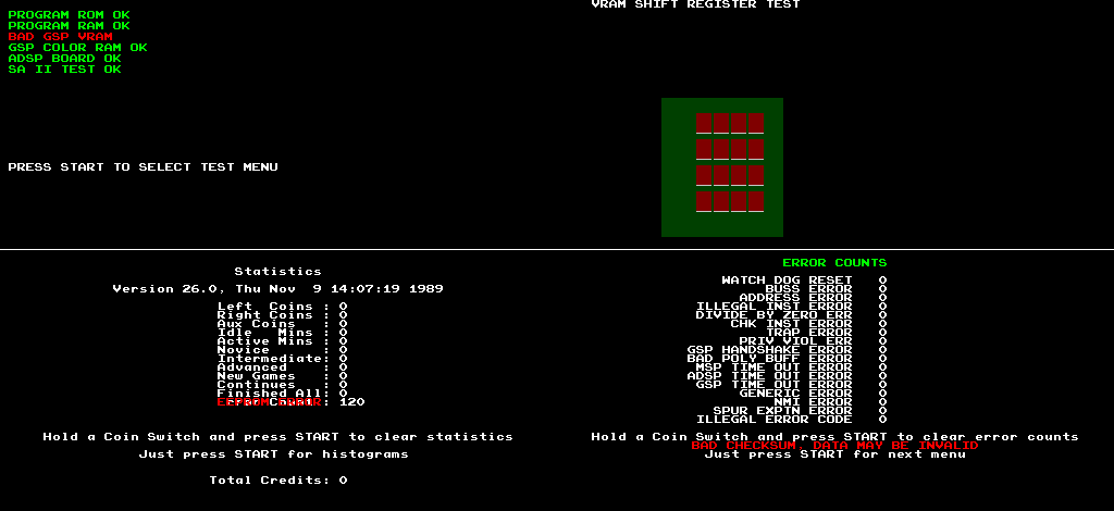 The self test run when the game is put into service mode displays a red message "BAD GSP VRAM". Running the associated VRAM SHIFT REGISTER TEST in the SPECIAL FUNCTIONS -> MAIN BOARD GSP TESTS menu shows red blocks related to the vram. All other tests show these as green. There are also errors on some screens when cycling through the OPERATOR SCREENS. These can be cleared (hold 5 or 6 key and press 1) and don't ever return, but they are always present from the first time the game is run until you clear them. I don't know if they are related somehow. |