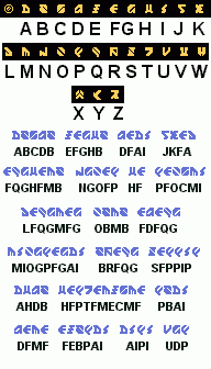 Description At the end of thunderl, there's a message written in a near-illegible font that seems to not be used anywhere else in the game (that I noticed). I found this font in F4 (page down). In this image, the black background stuff is from the gfxset, the blue stuff is lifted from the ending screenshot, the black text is a guess at what it says. This is obviously wrong...