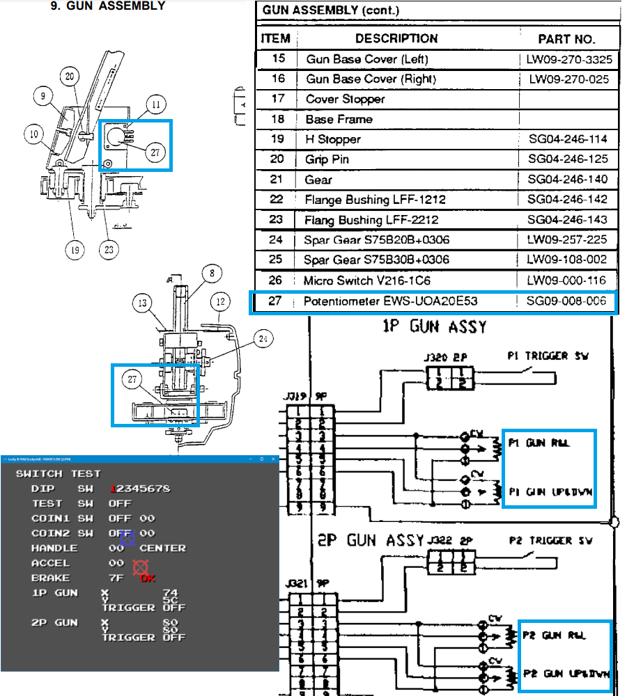 I found the manual for this game (not in Mame Extras again) and attached it along with images of the gun assembly and wiring diagrams. The manual was located at this url: https://www.manualslib.com/brand/namco/arcade-game-machines.html Maybe there are other manuals not usually available over there that could help people and projects out, I haven't checked them all yet. Todd of TNT Amusements talks about the game and guns (also says it has no optics) in the following video, and even has Operation Thunderbolt and Revolution X guns hooked up to it. The original guns are just plain looking pistols. EDIT: This game shares some pieces of hardware with the first Steel Gunner game. Looking back through that manual I see some of the same parts and numbers that are in the image I attached (they all start with SG04). They even have the same pots, "49 VOLUME EWS-UOA20E53 008-006" on page 27 http://www.aurcade.com/games/manuals/00000794.pdf I made mention of the Steel Gunner games being hooked up wrong in another report previously https://mametesters.org/view.php?id=8684 and this supports it. I don't understand why these and several other shooters using sticks just like Terminator 2 or Alien 3 The Gun are mapped to the lightgun inputs in mame. Anything using pots and lacks optics is just a toy gun on a flight stick, so should be AD_STICK. |