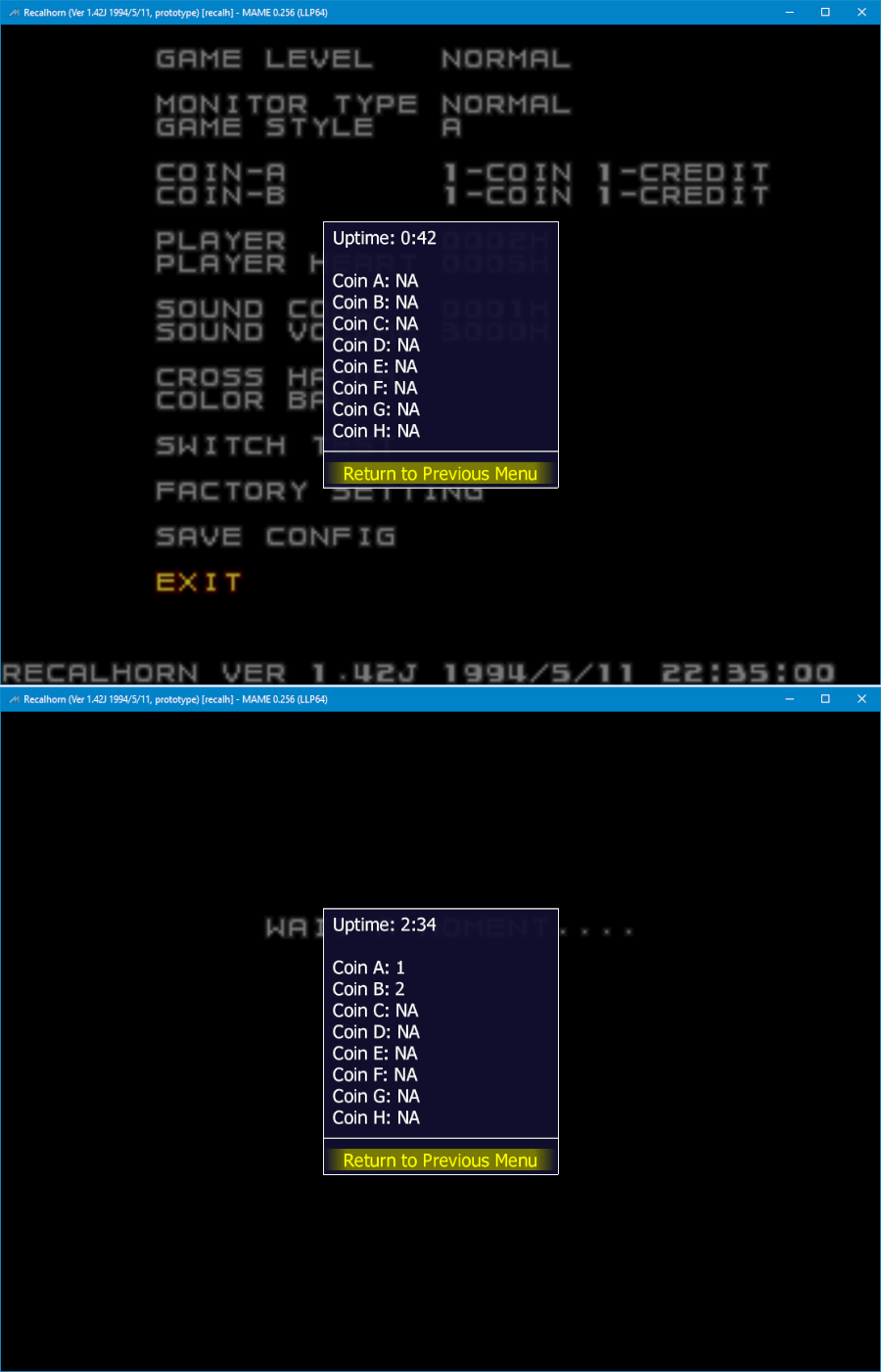 1. Run recalh 2. Press F2, then TAB to Bookkeeping Info to view the current counter totals. 3. Exit service mode and then view the counter totals again. One or both should have increased by at least 1. 4. Wait until the title screen and add a credit with 5 and then 6. View the counters again and they will not have changed, but 2 credits should show on the game screen. 5. Press 5 and 6 again, and view the counter totals one more time. They should have each increased by 1 this time. |
