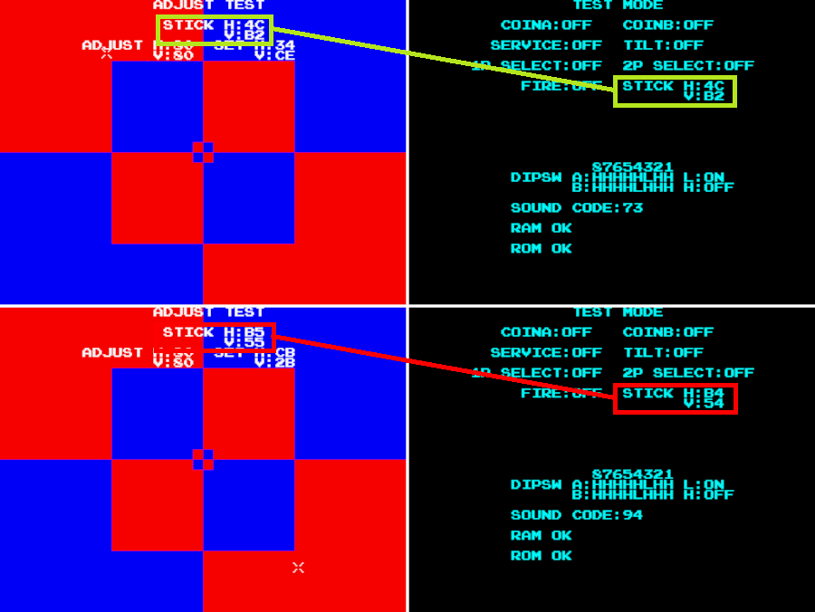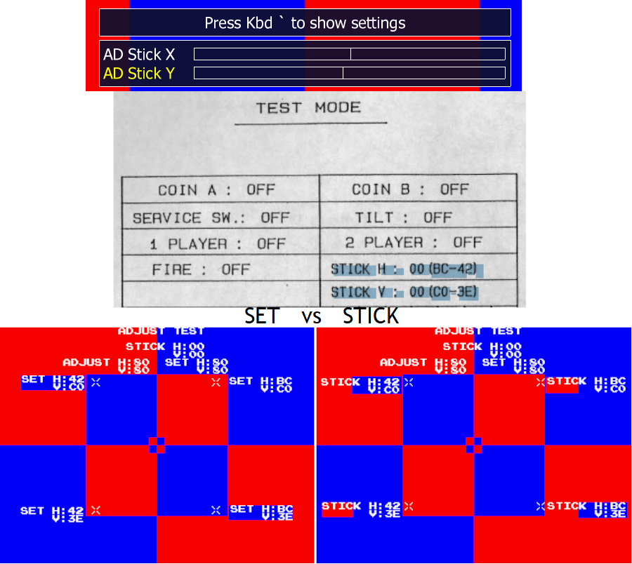 First image (open in new tab it is skewed a bit) shows the analogs being off center in the UI and a comparison of the SET vs STICK values in the adjust test. I turned off autocentering and slowly moved the controls until they lined up with what the manual says they should be. The left shows the cursor is a little too low with the SET values and the right shows the cursor being a little off to the right with the same values on STICK. The second image shows the max range for right and down goes a tiny bit more in the adjust menu than in the test menu (I highlighted them in red), and also that the X goes outside the checkered box. I know there are adjustment dip switches for the variable resistors (marked variable "registers" in the UI though), but those don't seem to help at all. They just offset the cursor which is already centered fine in the adjust test. EDIT: Before I forget, is the X axis supposed to be reversed by default in the UI serttings? I ask because the joystick version is flipped that way due to a bug and this seems odd. I usually see a reversed Y on flight sims and similar. |