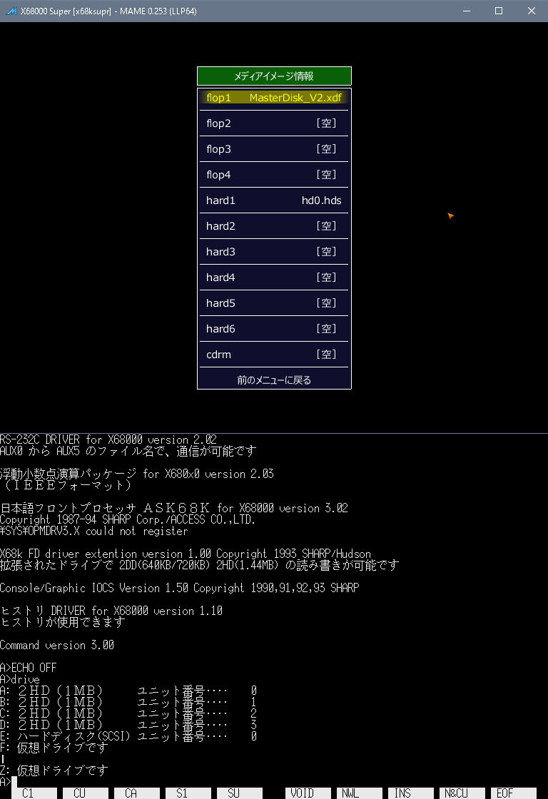 ex: x68ksupr (Same for X68000 (via cz6bs1), x68kxvi and x68030) [0253_nofd.png] Set (Load) hard1 (SCSI HDD Image) and reset Version 0.253 or earlier Displays Message prompting insertion of floppy disk. Version 0.254 or later Nothing displayed. [0253_infd.png] Set (Load) hard1 (SCSI HDD (.hds) Image), frop1 (.xdf Image) and reset Version 0.253 or earlier floppy and hard disk are loaded. Version 0.254 or later Not working. |
