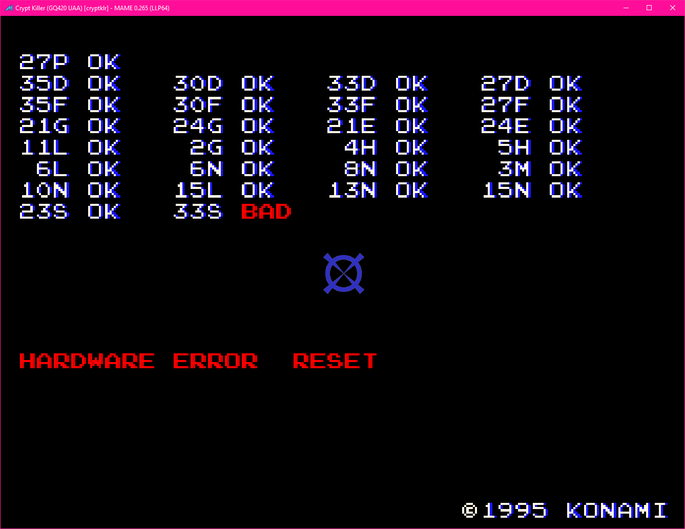 In the new version 0.265, Crypt Killer now fails to boot. When it gets close to be done, at the MEDIA Check part, throws an error followed with "HARDWARE ERROR" with a blinking "RESET" text. Also, i wasn't sure if this was related with the nvram i had so i deleted the eeprom but still does the same thing. Maybe it's related with what i saw in mameinfo: "konamigq.cpp: Use "new SCSI" 53CF96 and drives" |