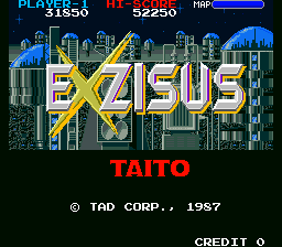 This only applies to the Japanese conversion kit version (exzisusa) and the TAD license version (exzisust). Upon loading either version, there appears to be a greenish hue which makes the color palette different from the proper color palette on the Japanese dedicated version (exzisus). This could be due to a bad dump of one common ROM ("b23-03.14l") in their ROM sets. A real hardware gameplay video (albeit a low-resolution one) of the TAD license version shows the proper color palette without the greenish hue. |