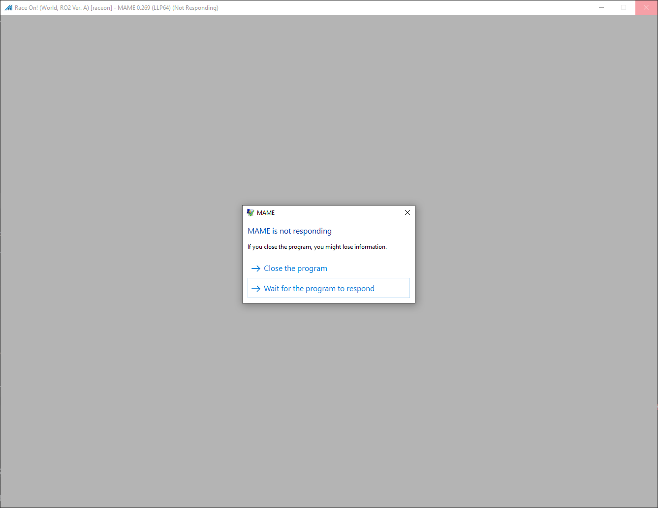 MAME freeze after Race On! self test, with "close or wait" prompt