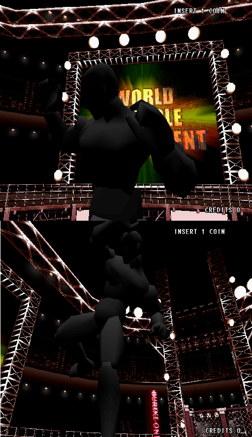I'm only reporting this because the red warning at the beginning only mentions sound issues, and not graphical issues. I think that maybe the devs missed this when the Hyper Neo Geo 64's graphics were finally emulated completely. Anyway, when you finish the game (with any character) and the credits are over, the game shows your character performing some moves. In the current MAME version, the character model shows no textures. See video of how it should look versus the images of how it looks on MAME: |
