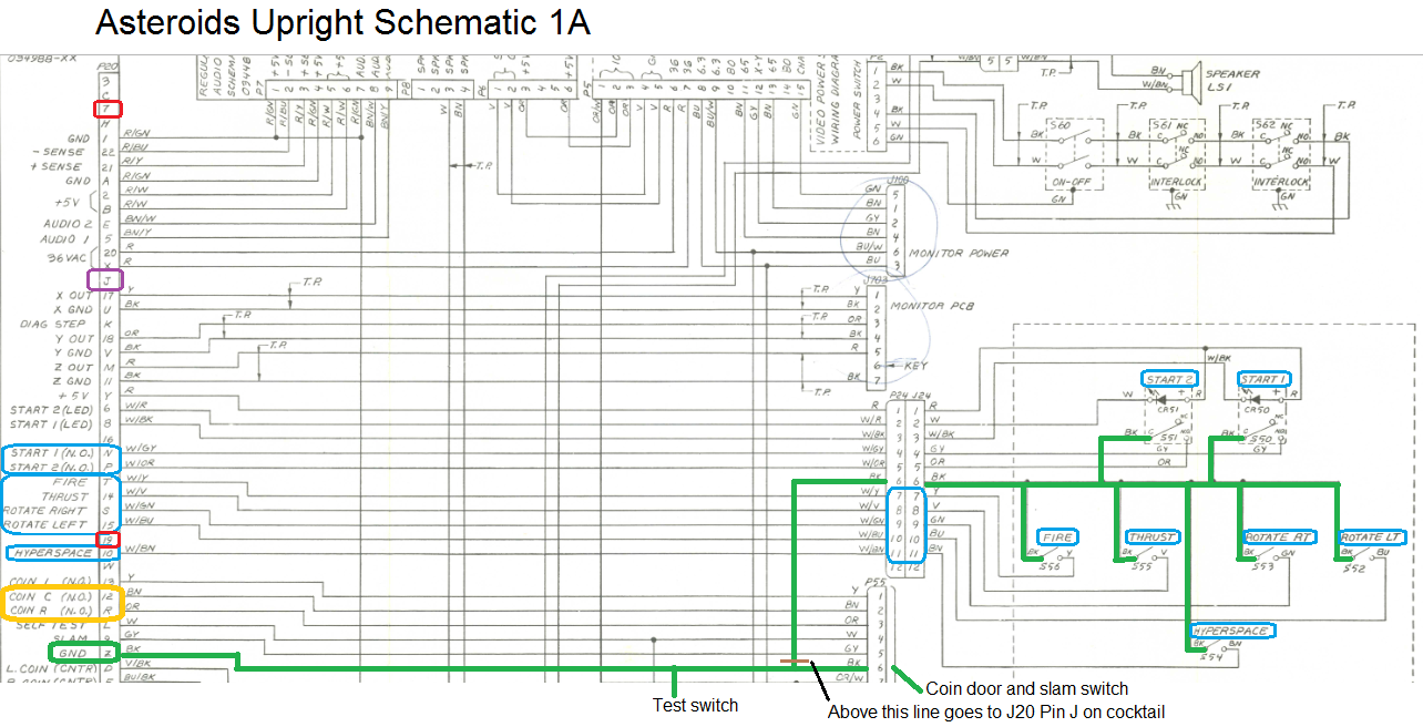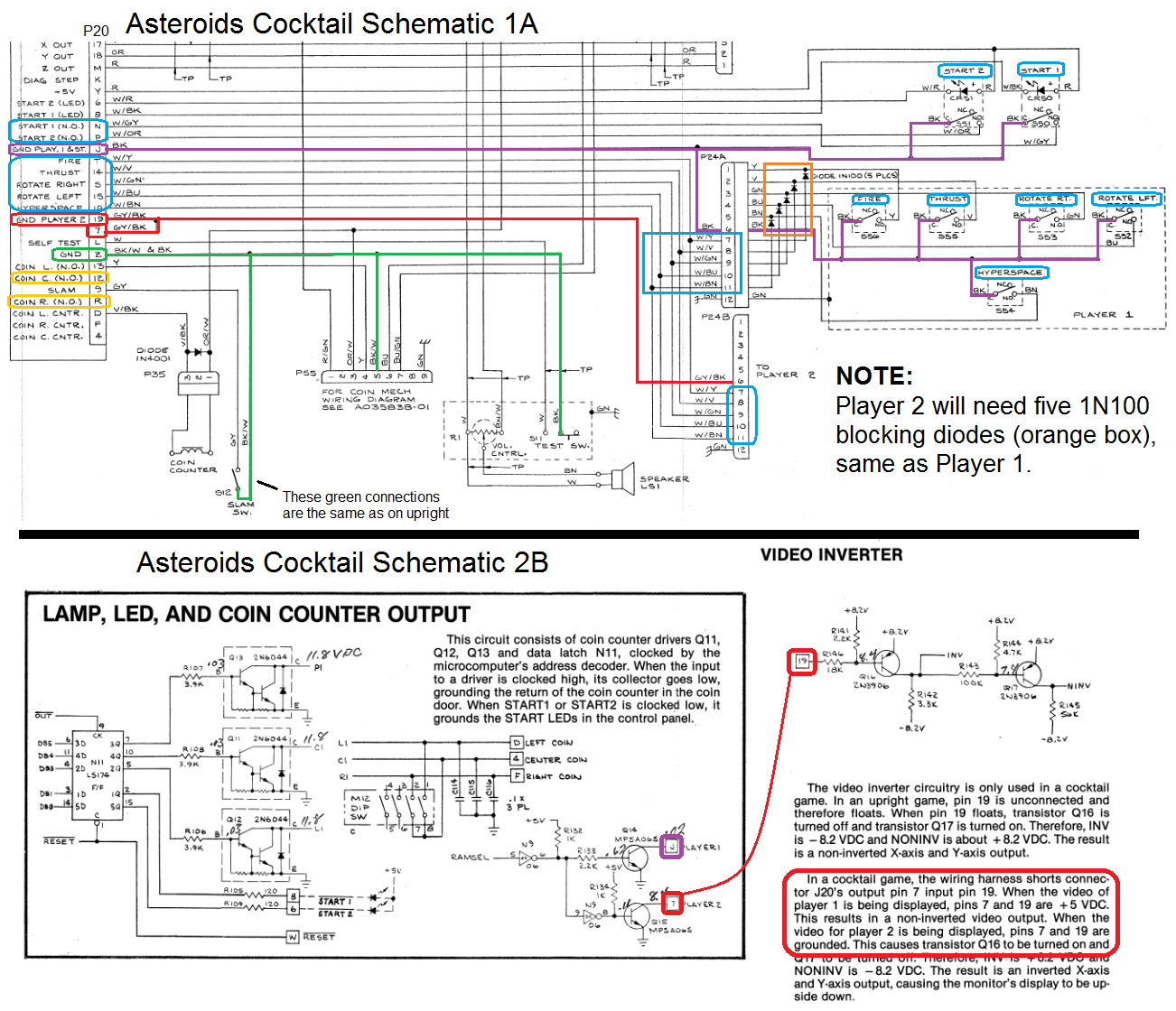 Add asteroid2 and astdelux to Affected Sets / Systems. ----------------------------------------------------------------- There are only five player inputs on the PCB -- Left (Pin 15), Right (Pin 5), Fire (Pin T), Thrust (Pin 14), and Hyperspace/Shield. (Pin 10) The blocking diodes image describes how each P1 and P2 control shares an input without interfereing when a player presses a button during the other player's turn. https://raw.githubusercontent.com/PL1-Arcade/MAME-Asteroids-Cocktail-Info/refs/heads/main/Blocking-Diodes.png The schematics highlight all of the differences between the upright and cocktail Asteroids machines. Asteroids Deluxe is almost the same. Schematics are on my GitHub. https://github.com/PL1-Arcade/MAME-Asteroids-Cocktail-Info ----------------------------------------------- Which MAME ROMs worked with Asteroids cocktail cabinets: https://www.ukvac.com/forum/threads/asteroids-cocktail-resets-and-flicker.81215/ I have a version -04 PCB with 035143/44/45-02 ROM chips.These chip numbers correspond to "asteroid2" ROM numbers, so that confirms that the "asteroid" (Rev. 4) and "asteroid2" (Rev. 2) ROMs supported cocktail switching. NOTE: There is no Rev. 3 ROMset. https://forums.arcade-museum.com/threads/wtb-asteroids-cocktail-pcb.395749/ There are multiple versions of Asteroids PCBs. Some of them lack the image flipping circuitry in the video section, which the cocktail requires. These boards are meant for upright cabs only.**NOTE: MAME currently supports Machine Config Cocktail for asteroid, asteroid1, and asteroid2** --------------------------------------------- Which MAME ROMs worked with Asteroids Deluxe cocktail cabinets? The latest revision "astdelux" (Rev. 3) definitely would have. **NOTE: MAME currently supports Machine Config Cocktail for astdelux, astdelux1, and astdelux2** Scott |