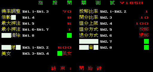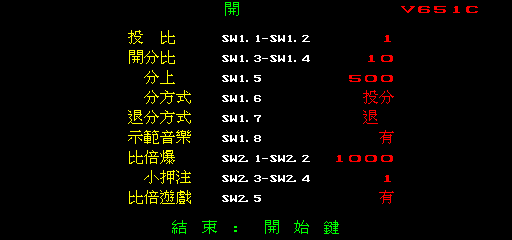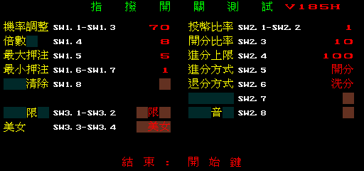 Solid rectangles are drawn in place of some characters in service mode, and some characters may incorrectly have coloured backgrounds. The exact colour of the rectangles seems somewhat random, but the characters never seem to be drawn correctly. For example in the lhb2 DIP switch display, one character is not drawn in the description for SW1.4, two characters are not drawn in the description for SW1.8, none of the four characters are drawn in the description for SW2.7, three characters are not drawn in the description for SW2.8 (should be “示範音樂” but only “音” is drawn correctly), and three characters are not drawn in the description for SW3.1-SW3.2. Several settings are not displayed correctly, either. |