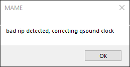 A screenshot of the error message is attached below. Audio recordings (of that same example in the reproduction steps) of how it sounds like on the VGM player (the possible bad rip) and how it sounds like on VGMRips (which would closely reflect how it sounds in-game) are also provided. Despite the VGM player's "Imperfect sound" flag, the majority of games that use QSound chips have the sound status as "OK." Only the ZN-based ones have imperfect sound flags, but they may sound better in-game than on the VGM player. |