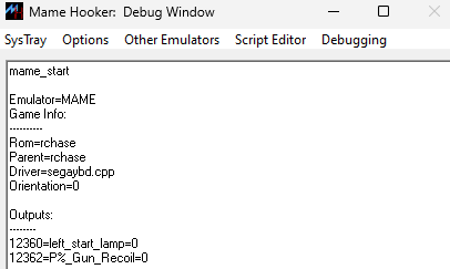 In mame.ini set output to windows launch Mame Hooker 5.1 load rchase insert credits start game start shooting observe Mame Hooker debug window for Outputs |