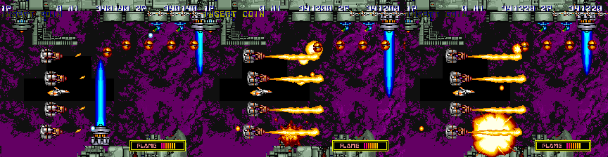 While playing a single player game with the 2-player ship (the red ship), your score is criss-crossed. Any ships you shoot down register under the score for 1P, while any bonus capsules you pick up register under 2P. Your entire score should register under 2P. Follow-up by ShimaPong in 0.116u1: It will be run_collisions (K052591 collision emulation) routine bug. See run_collisions in drivers/thunderx.c // set flags p0[0] = (p0[0] & 0x9f) | 0x10; p1[0] = (p1[0] & 0x9b) | 0x10; If collide with an object, set the flags. p0[0] is for an enemy and p1[0] is player ship or player's bullet. I have found that bit 2 (0x04) of the value stored into p1[0] is "Player" flag (OFF = 1P/ON = 2P). And the program checks this bit in p0[0] (NOT p1[0] itself!) then sets score for each players.Therefore it needs to set in this routine. // set flags p0[0] = (p0[0] & 0x9f) | (p1[0] & 0x04) | 0x10; p1[0] = (p1[0] & 0x9b) | 0x10; It seems to work fine... but incomplete. When 2P has "penetrator" type weapon, like Flame, Tail Laser etc, a point is sometimes added to 1P. If 2P gets these weapons, 0xe5 is set. It's correct. But 0xe1 is stored newly at hit. It's the same flag as 1P. The cause is the flag setting for p1[0]. 0x9b kills "Player" flag so that it should use 0x9f instead, I think. // set flags p0[0] = (p0[0] & 0x9f) | (p1[0] & 0x04) | 0x10; p1[0] = (p1[0] & 0x9f) | 0x10; OK, no problem. |