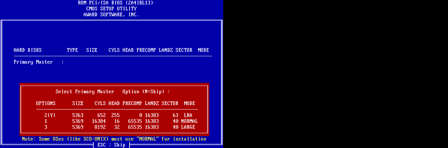A lot of older bioses had limits on what size hard drive they could properly support. For example, a 386 computer would not normally handle more than 512MB. DOS itself is limited to 2GB maximum. Using a 5.4 GB drive? No idea what support you could expect. |