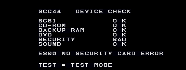 1. Start the game 2. If boot was complete, you should see "E150 BACKUP DATA ERROR", both "BACKUP ROM BAD" and "SECURITY BAD". 3. Enter service mode and select "BACKUP CLEAR" and press Yes using SW-2 button, later exit service mode using SW-7 button and later SW-2 button. 4. If boot was complete, you should see "E800 NO SECURITY CARD ERROR" and "SECURITY BAD". |