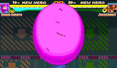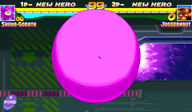 Do Shuma Gorath's super move when his power is full. It's a quarter circle forward (like Ryu's hadoken), and press 2 attack buttons (eg. ctrl+alt in MAME). Then get close to the opponent and do a strong attack to start the super move. To make it easier: Enable cheats, set energy of both players to infinite, set power to infinite, set time to infinite. Start a 2 player game. |