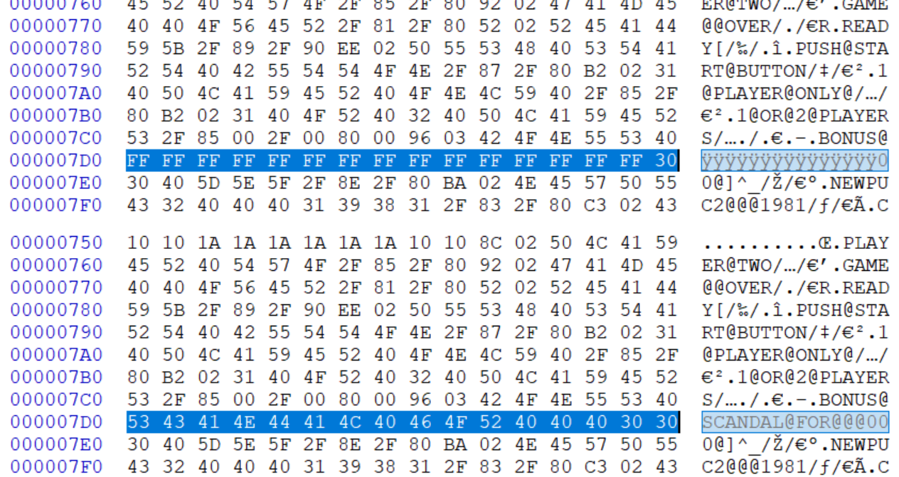 Not a bug. Viewing the rom files in a hex editor as seen above, shows that the word "SCANDAL" and the word "FOR" have been removed from