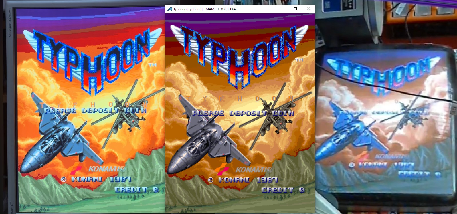 Is it from this video? I think something might be wrong with the PCB. I posted a picture from another PCB reference. It's much closer to MAME, I think 1-pixel off towards the top-left. Which could as well mean that the other tilemap is off by 1 pixel. I know it's low quality, but look at the first "O" of the small "T Y P H O O N" letters. |