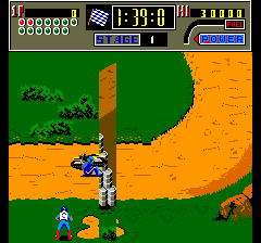 Play the game (good enough to get to stage 3 or 4), and it'll usually happen at least once. An easier way to repro on 0.286: boot sprcros2, hold INS to fast forward and wait for the 3rd demo sequence. The biker will collide with a glitchy obstacle until the time runs out. This easier method won't work on 0.287 if you clock the Z80s at 2.5MHz. |