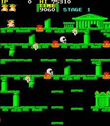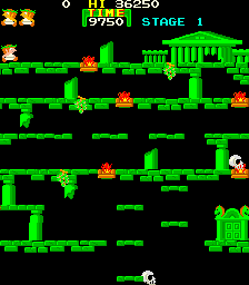 On the first level, about half the pixels in the column near the bottom-left corner appear to be out of place (fig.1) and there are a couple of brown pixels on the ledge beside that column that should be on the horse statue's head on the other side of the screen. When you've played thru it to around level 6 or beyond, lose all your men, and start a new game, the pixels appear to be correct, the column appears correctly; most of the pixels on the entire screen have shifted (fig.2). However, there are usually some stuck pixels (see the second linked screenshot, near the left bottom corner there is a brown line that didn't disappear). This usually gets stuck during stage transitions, when the pixels shift off the screen, and correct themselves (disappear) a few levels later. |
